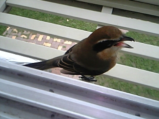 モズが窓ガラスにあたって、ベランダで脳しんとう起こしてますよ。
