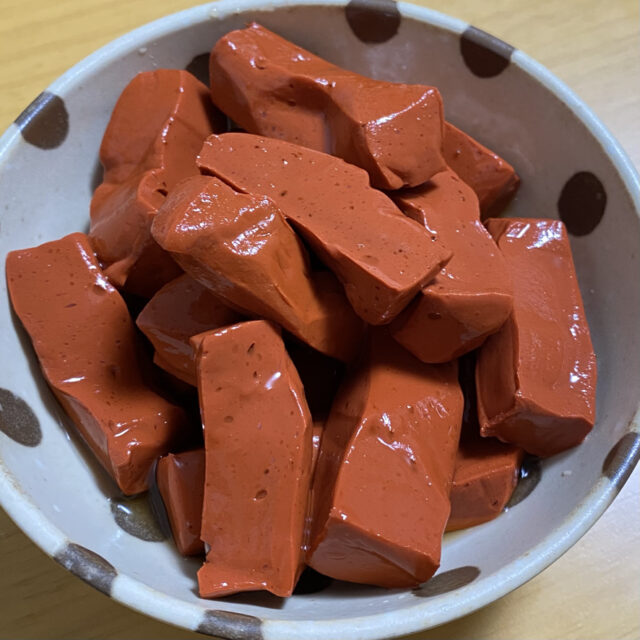 晩ご飯に赤こんにゃく。