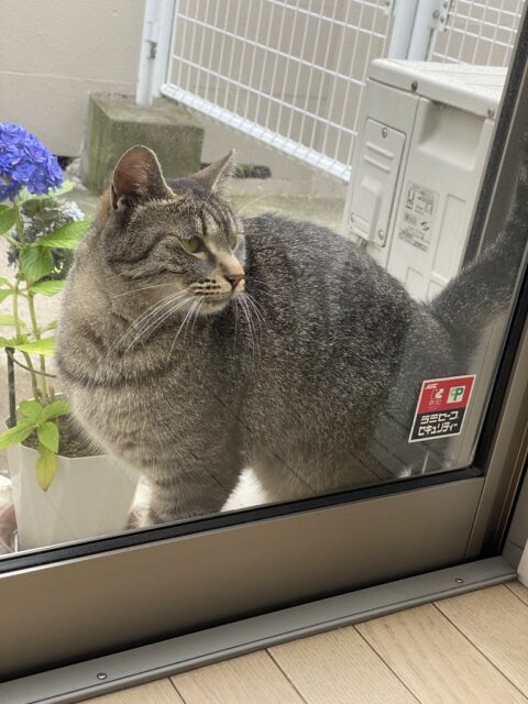 キジトラちゃんが窓の外で・・・その段差に乗るか。