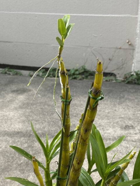 デンドロビュームの先っぽから出てきた新芽、育ってます。
