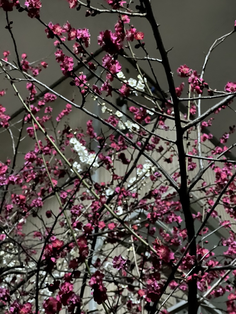 こちら。紅白の梅が同じところに咲いている。