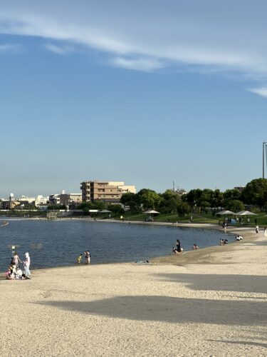 夕方に浜辺公園のほうにお散歩してみると、やっぱり海岸なので人がそれなりに。