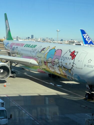 搭乗予定の飛行機は、激かわサンリオジェットでした。